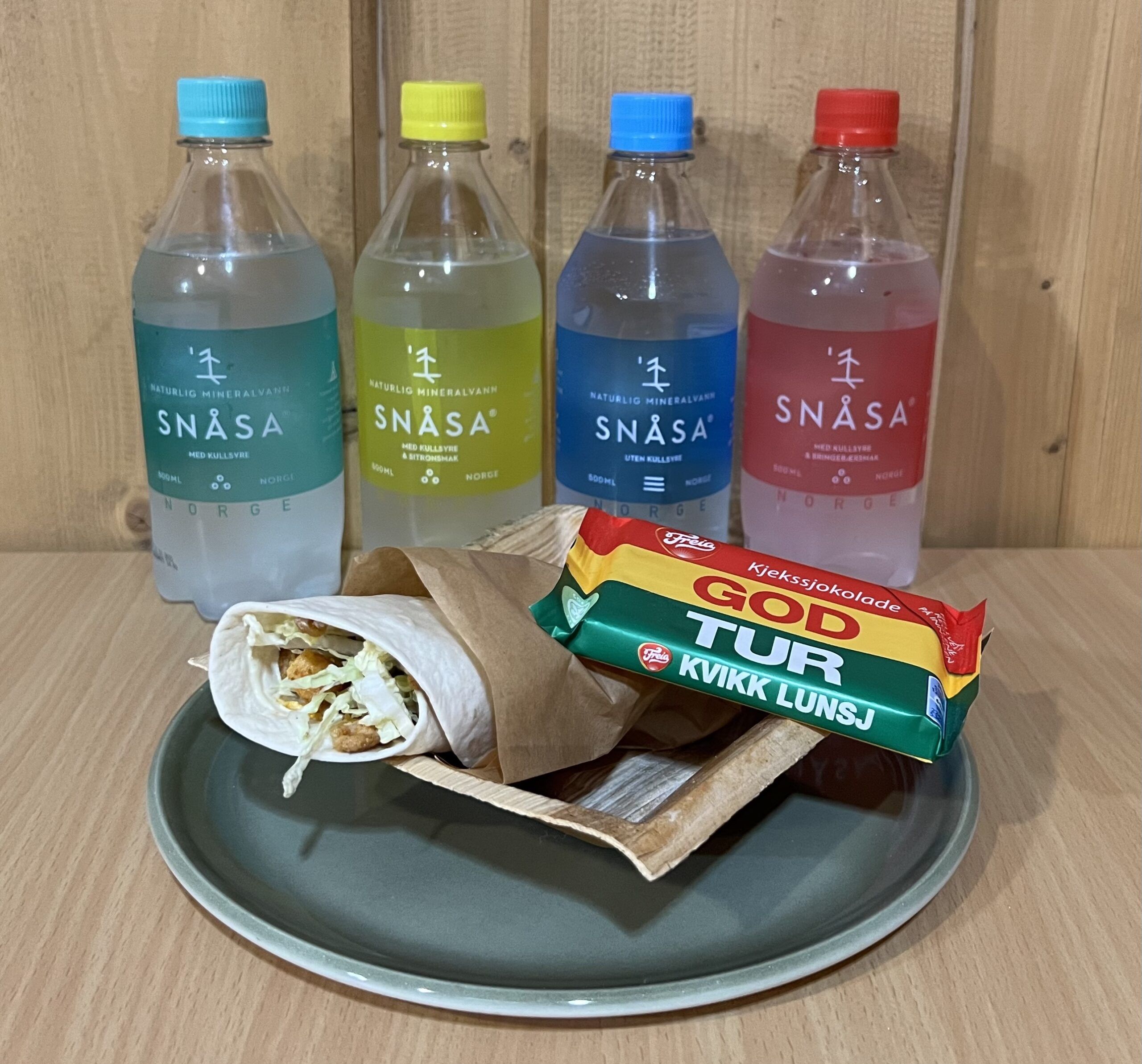 Valgfri Snåsavann med kullsyre & Sitron, kullsyre & bringebærsmak, vann med kullsyre og vann uten.